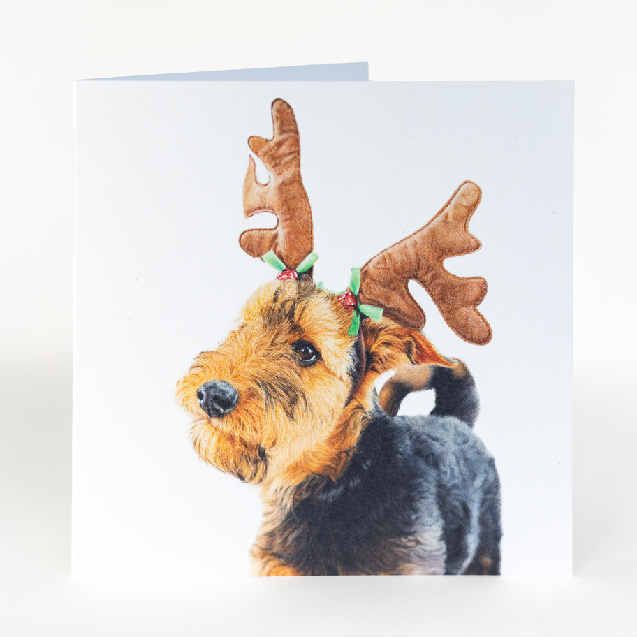 Made using my original coloured pencil artwork of a dog called 'Trevor'. This cute christmas card features a puppy airedale terrier, wearing a pair of reindeer antlers. Perfect for any dog lover! Can you resist those soulful puppy dog eyes?
